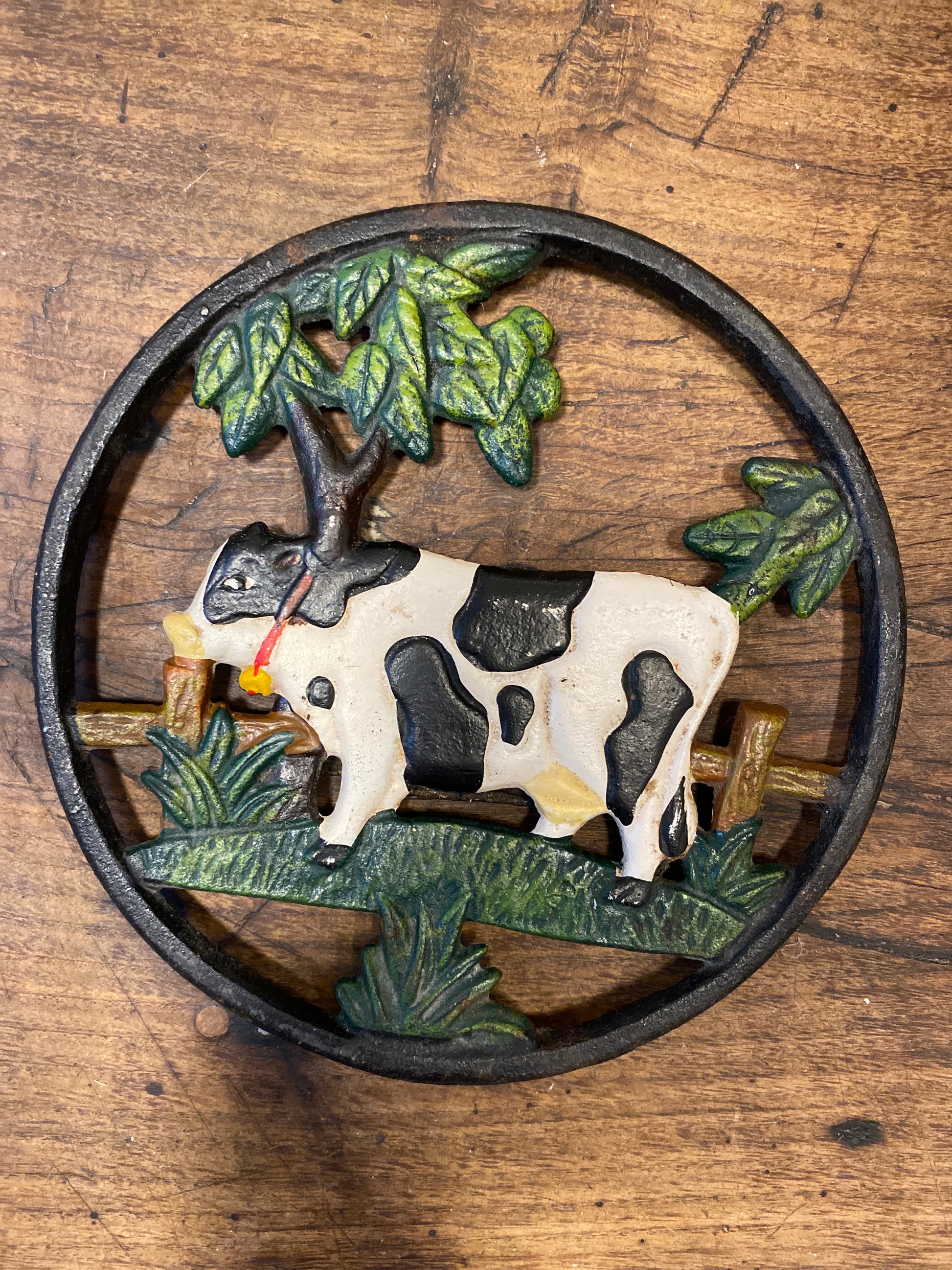 French cast iron trivet featuring a Normande cow beneath a tree — a classic countryside scene from Normandy.
