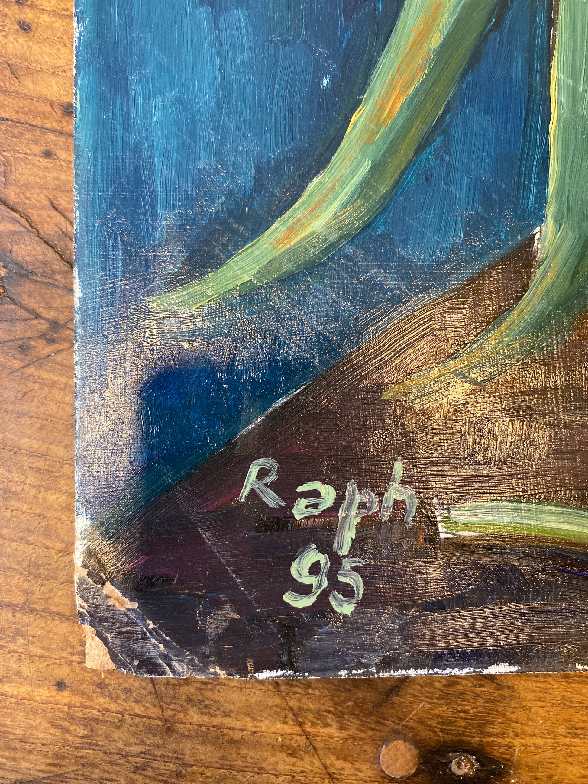 Still life of fiery red tulips in a glass vase, signed Raph 95. Full of color and charm