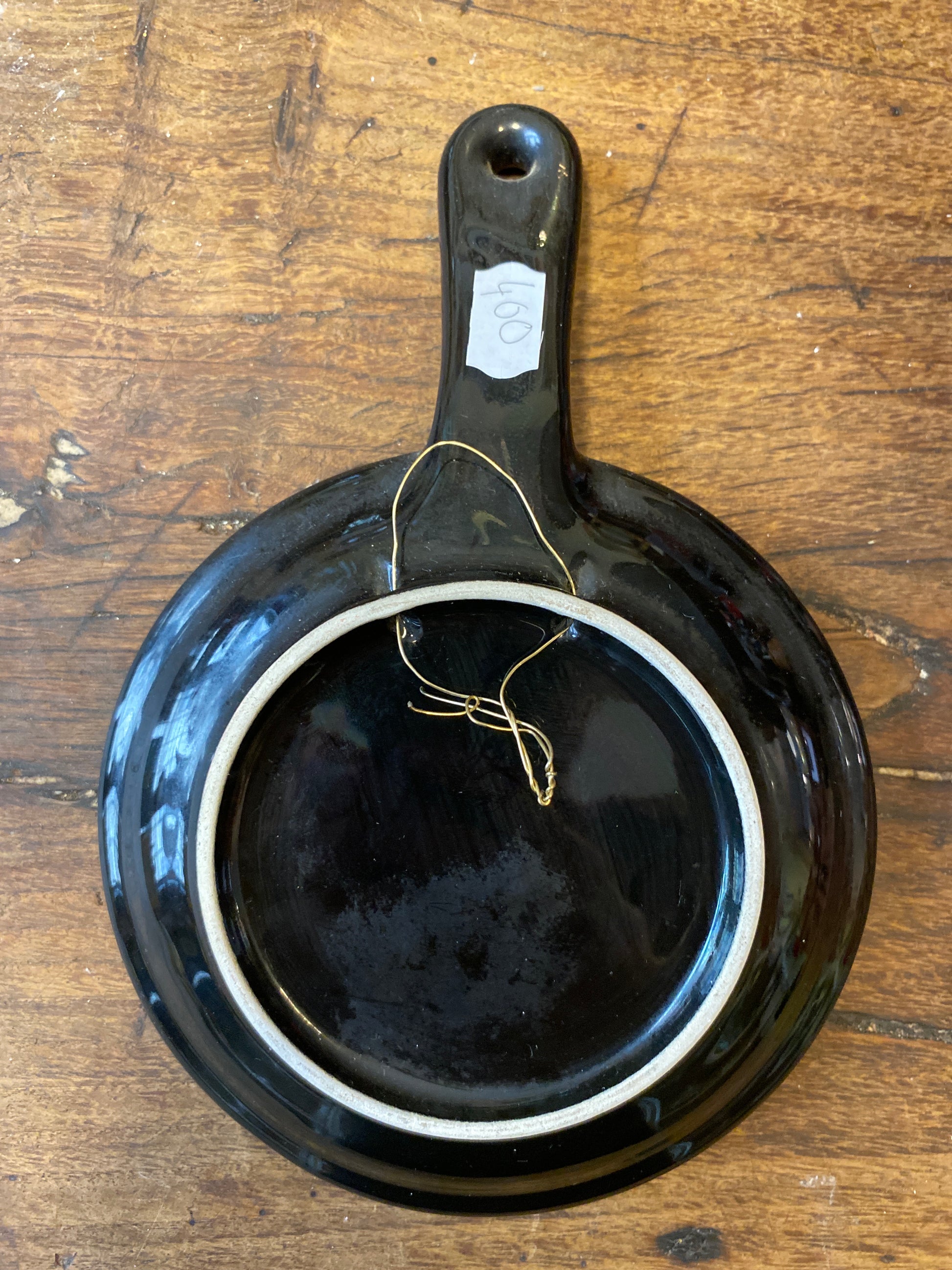 A colorful French majolica wall plate in the shape of a skillet with a vibrant fish and scallop shell on glossy black glaze.